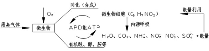 惡臭氣體成分不同,其分解產(chǎn)物不同,不同種類的微生物,分解代謝的產(chǎn)物也不一樣。對于不含氮的有機物質(zhì)如苯酚、羧酸、甲醛等,其最終產(chǎn)物為二氧化碳和水;對于硫類惡臭成分,在好氧條件下被氧化分解為硫酸根離子和硫;對于像胺類這樣的含氮惡臭物質(zhì)經(jīng)氨化作用放出NH3,NH3可被亞硝化細菌氧化為亞硝酸根離子,在進一步被硝化細菌氧化為硝酸根離子。