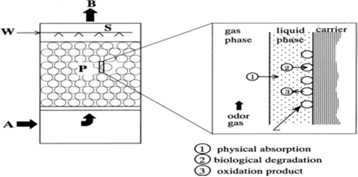 經(jīng)生物洗滌段處理后的氣體由下而上進生物過濾段,在氣體由下而上運動時,氣體中的異味分子穿過填料層,與填料表面形成的生物膜充分接觸,被微生物氧化、分解,異味分子被轉(zhuǎn)化為二氧化碳、水、礦物質(zhì)等,從而達到異味凈化的目的。